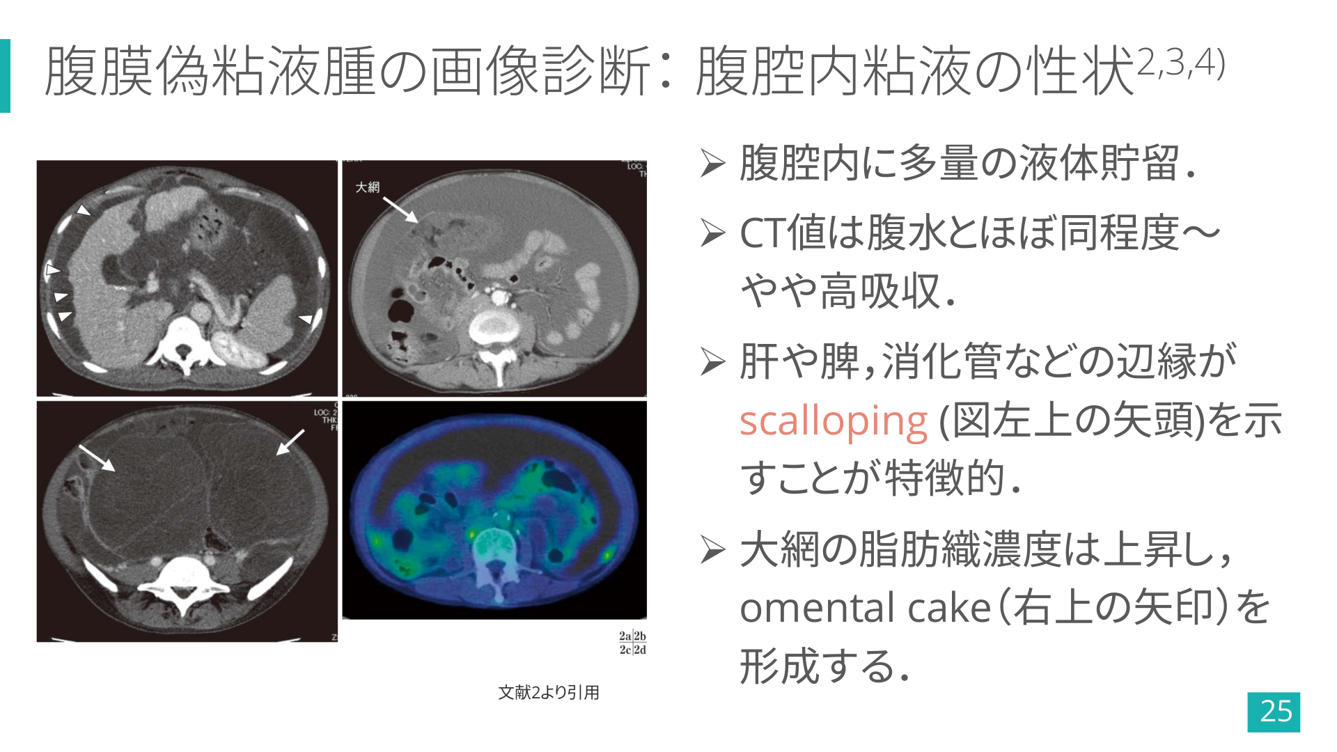 #25. 腹膜偽粘液腫の画像診断: 2,3,4) 腹腔内粘液の性状 Ø 腹腔内に多量の液体貯留. Ø CT値は腹水とほぼ同程度〜 やや高吸収. Ø 肝や脾,消化管などの辺縁が scalloping (図左上の矢頭)を示 すことが特徴的. 文献2より引用 Ø 大網の脂肪織濃度は上昇し, omental cake(右上の矢印)を 形成する. 25