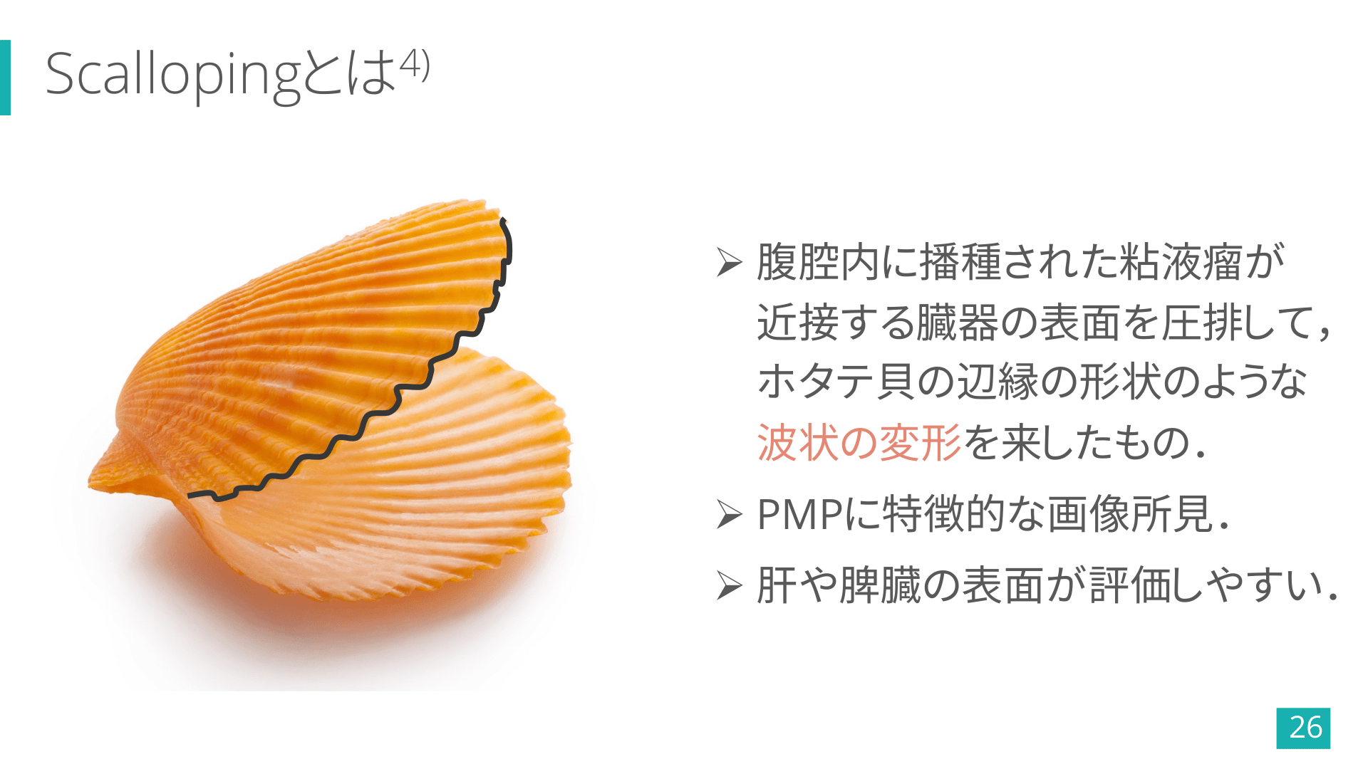 #26. 4) Scallopingとは Ø 腹腔内に播種された粘液瘤が 近接する臓器の表面を圧排して, ホタテ貝の辺縁の形状のような 波状の変形を来したもの. Ø PMPに特徴的な画像所見. Ø 肝や脾臓の表面が評価しやすい. 26