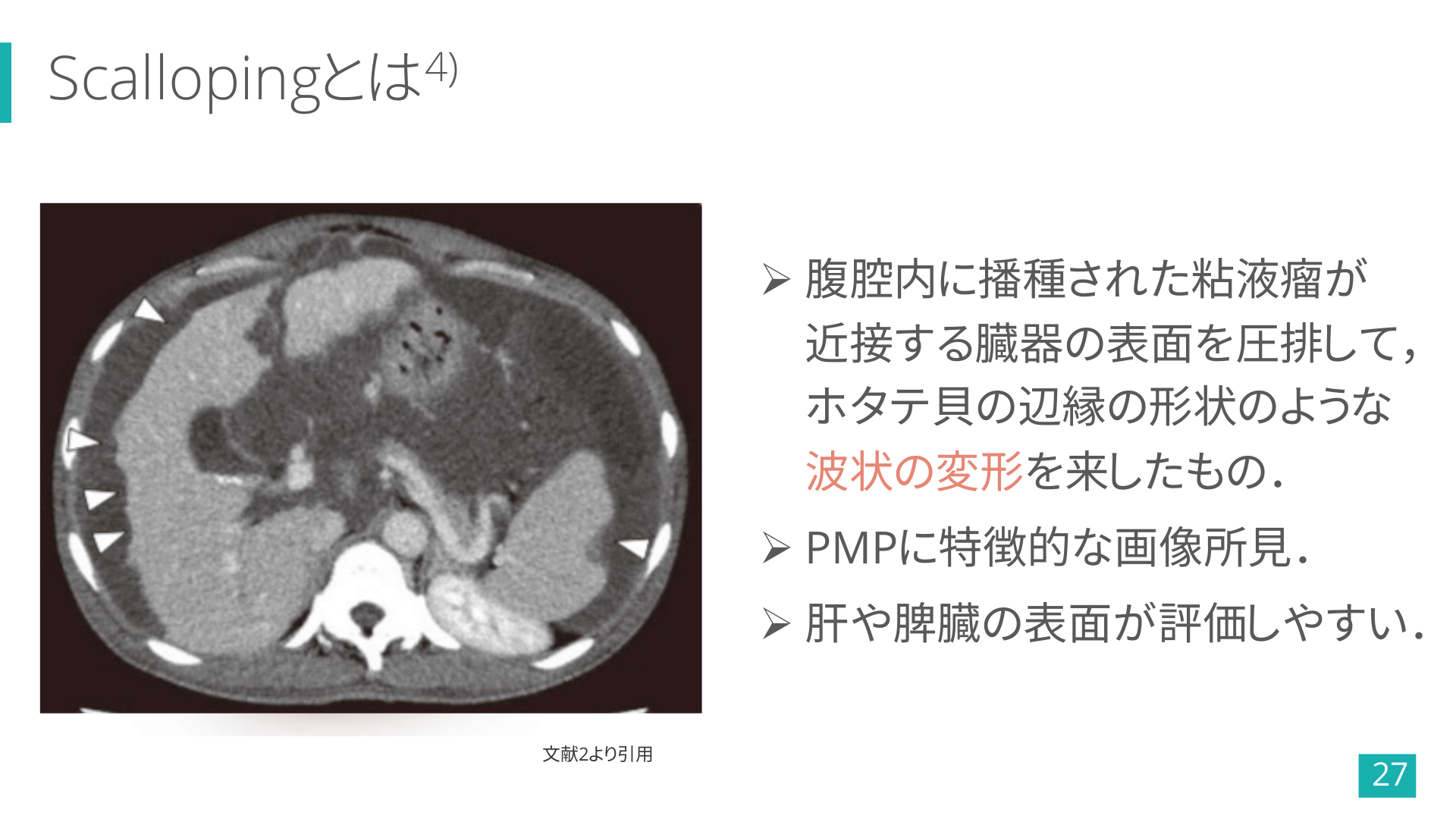 #27. 4) Scallopingとは Ø 腹腔内に播種された粘液瘤が 近接する臓器の表面を圧排して, ホタテ貝の辺縁の形状のような 波状の変形を来したもの. Ø PMPに特徴的な画像所見. Ø 肝や脾臓の表面が評価しやすい. 文献2より引用 27