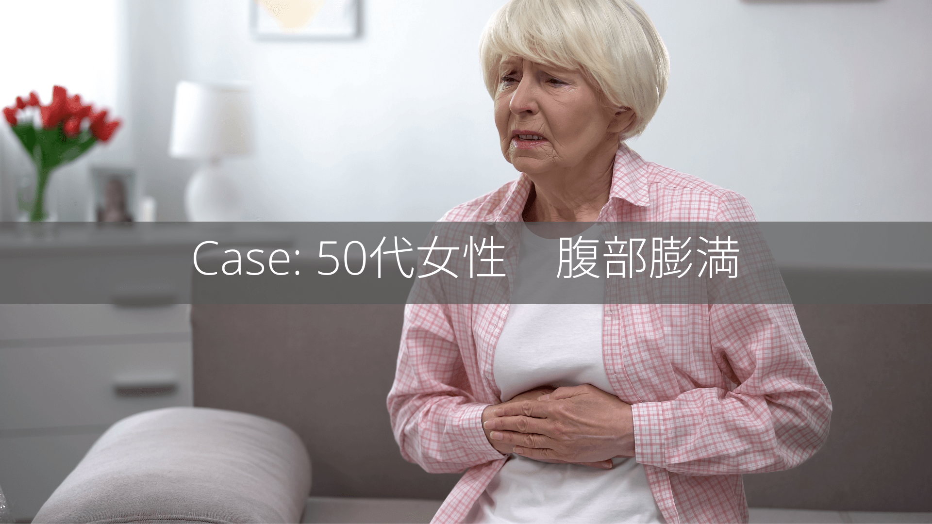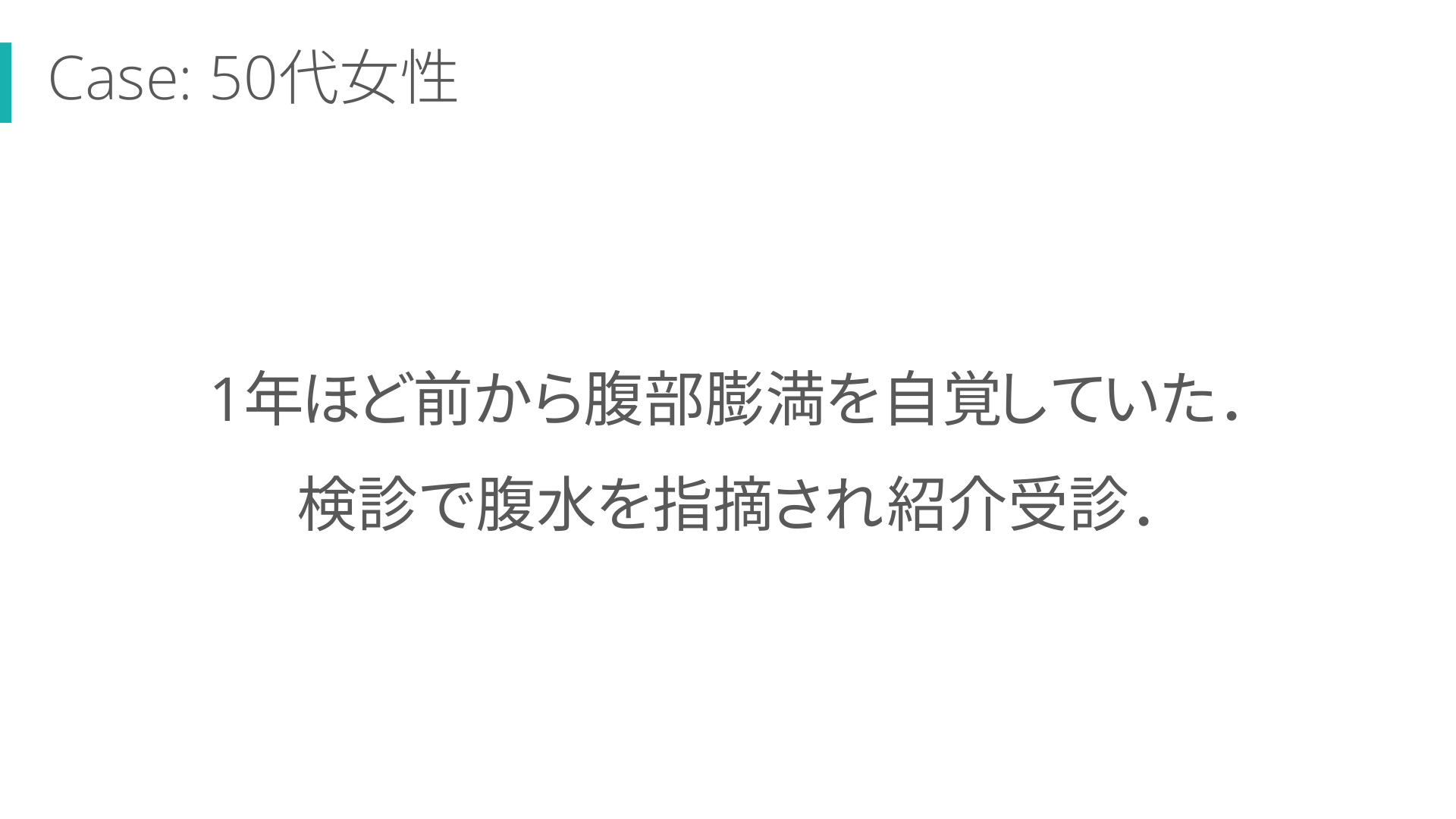 #4. Case: 50代女性 1年ほど前から腹部膨満を自覚していた. 検診で腹水を指摘され紹介受診.