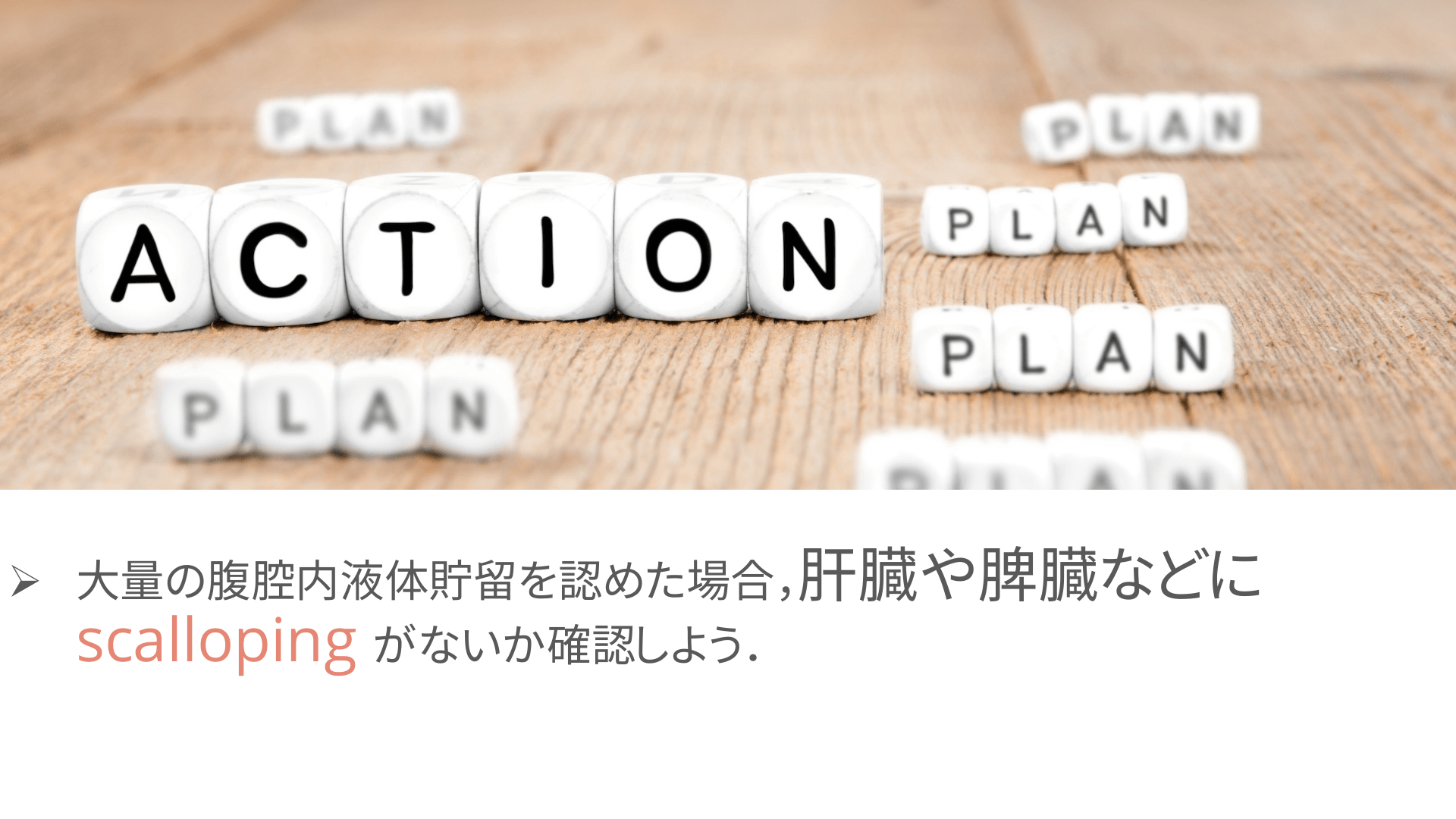 #30. 今回の症例で診断の流れを復習!! ① 腹水多いな〜... ② あれ,肝臓に食い込んでる?? ③ scalloping ?? 30