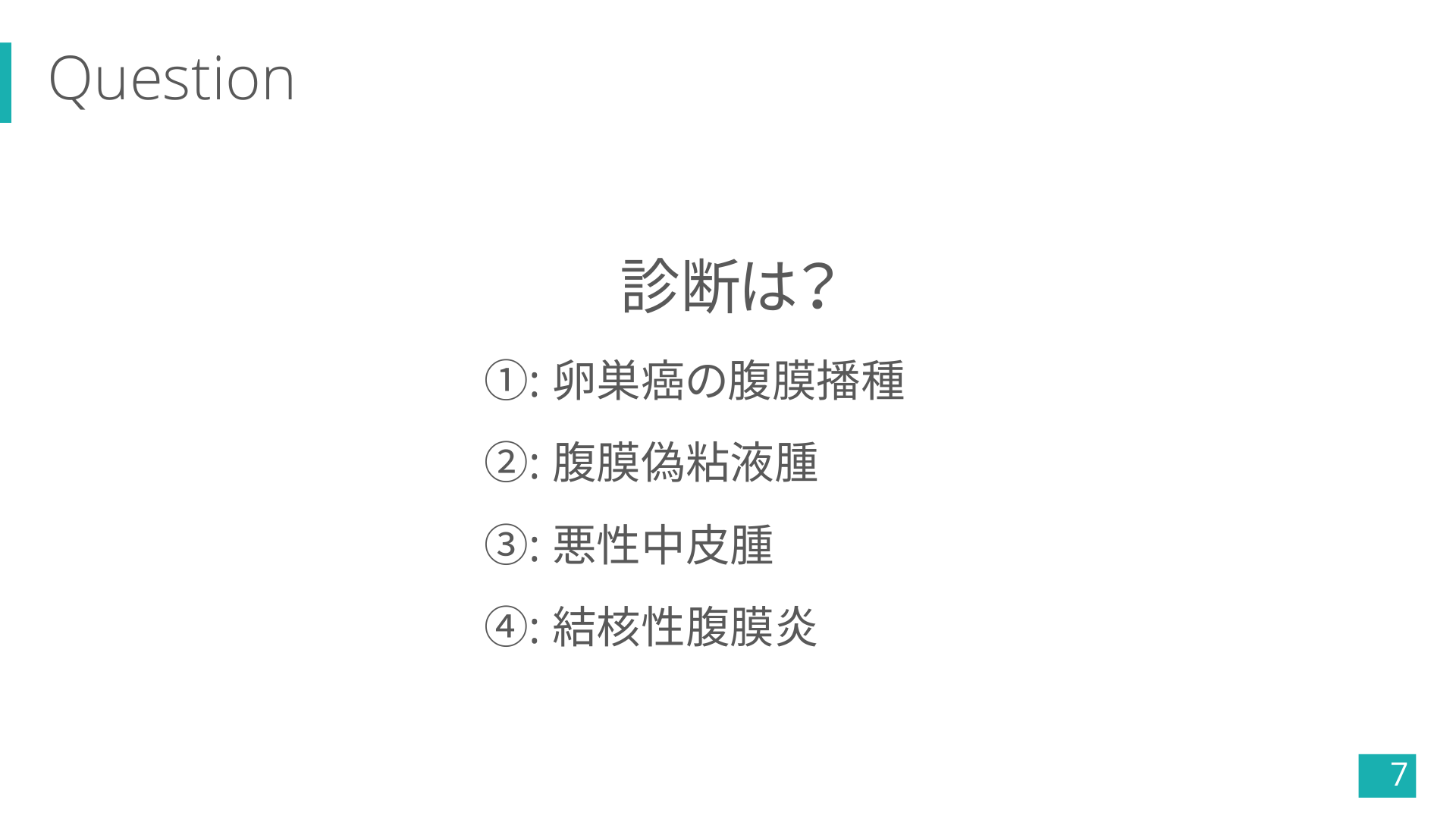 #7. Question 診断は? ①: 卵巣癌の腹膜播種 ②: 腹膜偽粘液腫 ③: 悪性中皮腫 ④: 結核性腹膜炎 7
