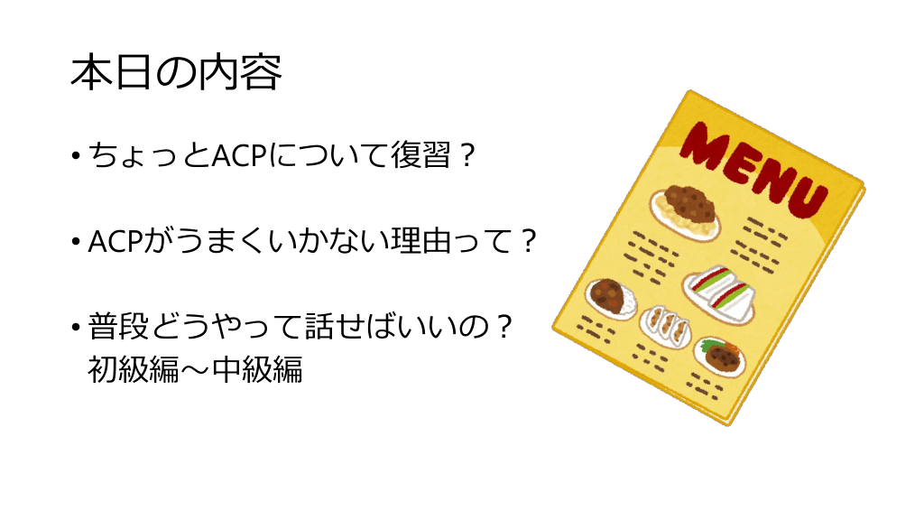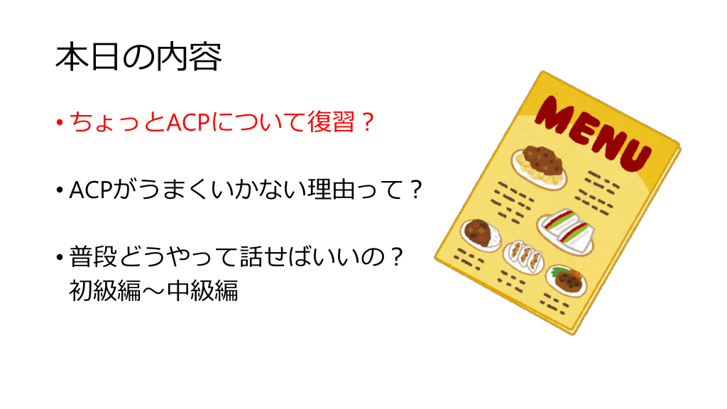 ACP(アドバンス・ケア・プランニング)とは、「年齢と病期にかかわらず、成人患者と、価値、人生の目標、将来の医療に関する望みを理解し共有し合うプロセスのこと」とされ、「人生会議」の名称での普及活動も進められています。