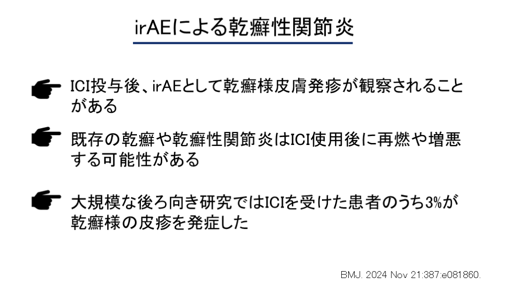 #8. irAEによる乾癬性関節炎 ICI投与後、irAEとして乾癬様皮膚発疹が観察されることがある 既存の乾癬や乾癬性関節炎はICI使用後に再燃や増悪する可能性がある 大規模な後ろ向き研究ではICIを受けた患者のうち3%が乾癬様の皮疹を発症した BMJ. 2024 Nov 21:387:e081860.