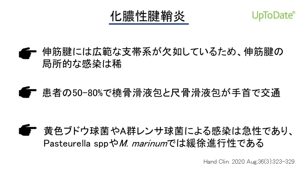 #16. 化膿性腱鞘炎 伸筋腱には広範な支帯系が欠如しているため、伸筋腱の局所的な感染は稀 患者の50-80%で橈骨滑液包と尺骨滑液包が手首で交通 黄色ブドウ球菌やA群レンサ球菌による感染は急性であり、Pasteurella sppやM. marinumでは緩徐進行性である