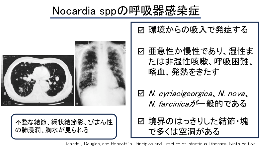 境界のはっきりした結節・塊で多くは空洞がある N. cyriacigeorgica、N. nova、N. farcinicaが一般的である Mandell, Douglas, and Bennett‘s Principles and Practice of Infectious Diseases, Ninth Edition