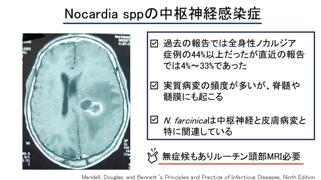 #23. Nocardia sppの中枢神経感染症 Mandell, Douglas, and Bennett‘s Principles and Practice of Infectious Diseases, Ninth Edition 過去の報告では全身性ノカルジア