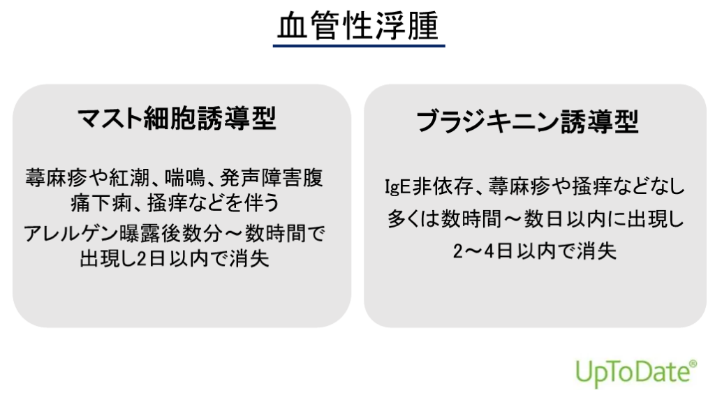 血管性浮腫 マスト細胞誘導型 蕁麻疹や紅潮、喘鳴、発声障害腹痛下痢、掻痒などを伴う