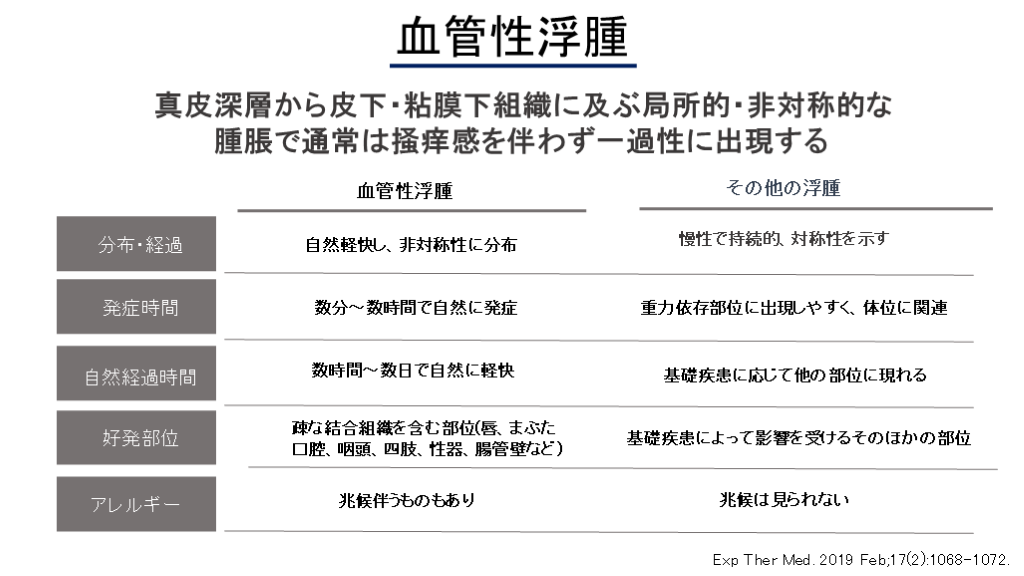 腫脹で通常は掻痒感を伴わず一過性に出現する Exp Ther Med. 2019 Feb;17(2):1068-1072. 分布・経過 発症時間 自然経過時間 好発部位 アレルギー 血管性浮腫 その他の浮腫 自然軽快し、非対称性に分布 慢性で持続的、対称性を示す 重力依存部位に出現しやすく、体位に関連 基礎疾患に応じて他の部位に現れる