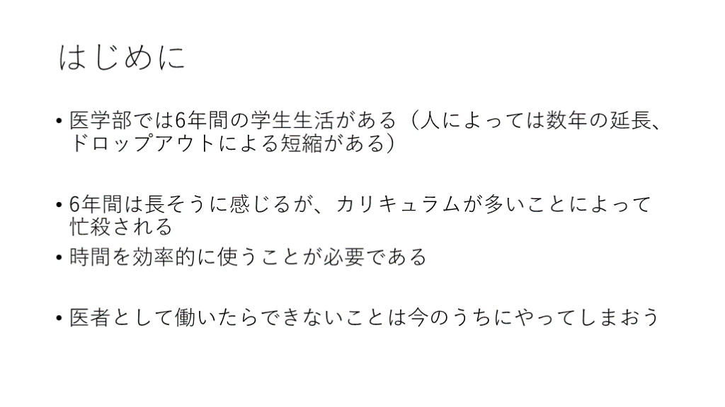 #2. はじめに 医学部では6年間の学生生活がある(人によっては数年の延長、ドロップアウトによる短縮がある)