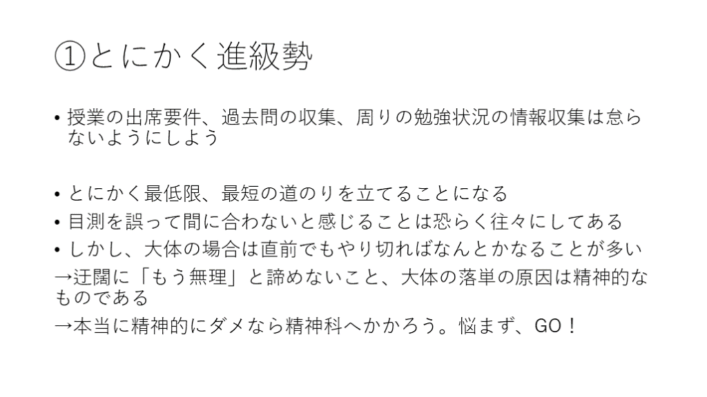 #4. ①とにかく進級勢 授業の出席要件、過去問の収集、周りの勉強状況の情報収集は怠らないようにしよう