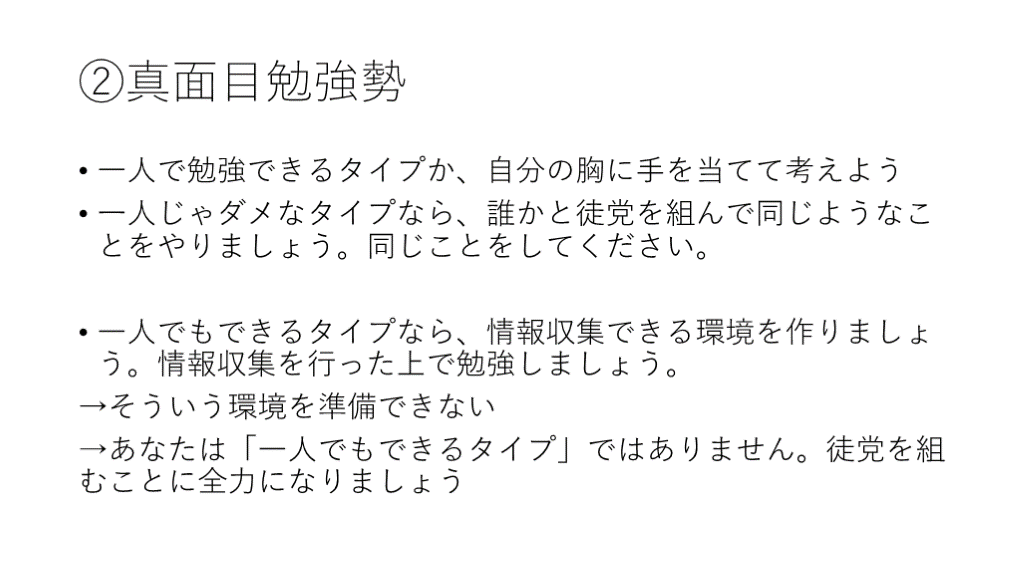 一人でもできるタイプなら、情報収集できる環境を作りましょう。情報収集を行った上で勉強しましょう。
