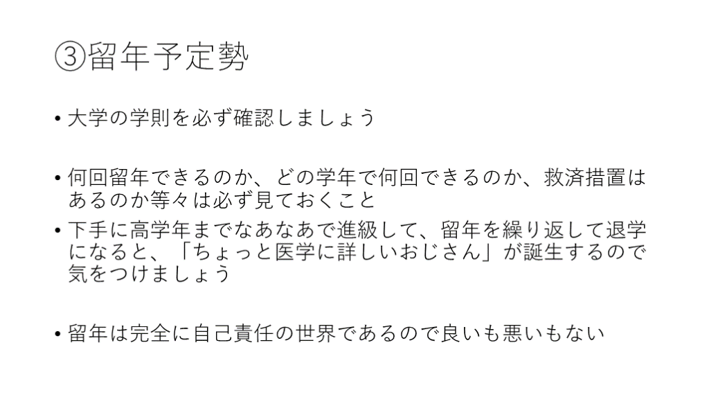 下手に高学年までなあなあで進級して、留年を繰り返して退学になると、「ちょっと医学に詳しいおじさん」が誕生するので気をつけましょう