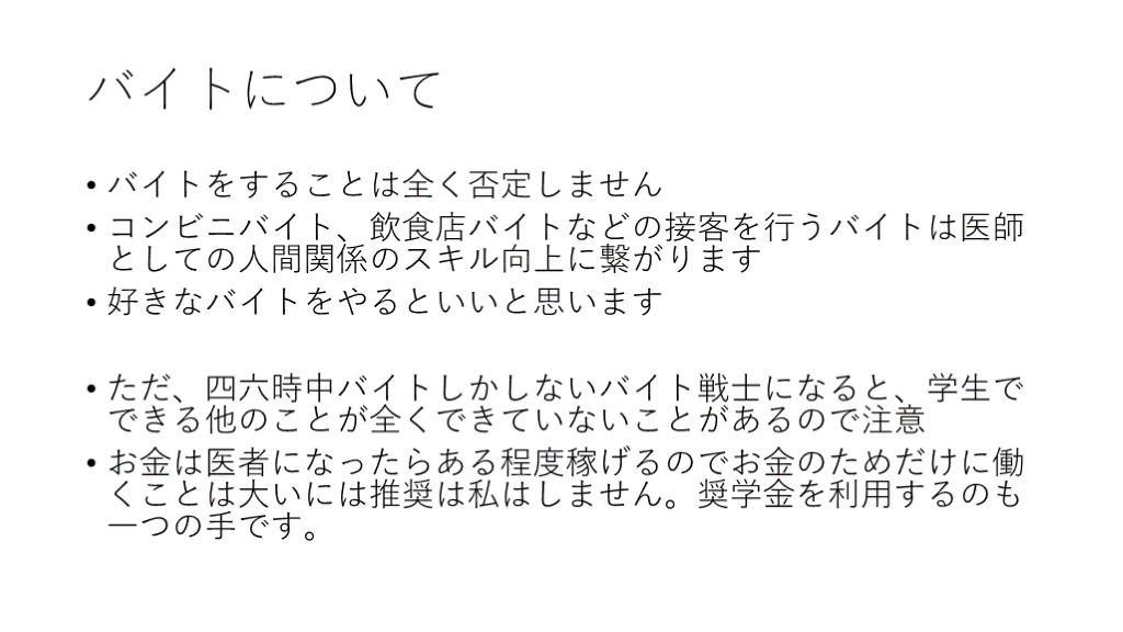 お金は医者になったらある程度稼げるのでお金のためだけに働くことは大いには推奨は私はしません。奨学金を利用するのも一つの手です。