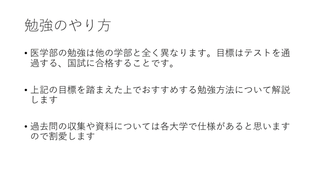 #11. 勉強のやり方 医学部の勉強は他の学部と全く異なります。目標はテストを通過する、国試に合格することです。