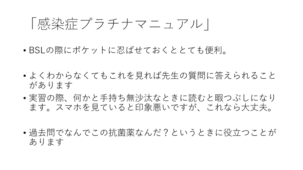 #17. 「感染症プラチナマニュアル」 BSLの際にポケットに忍ばせておくととても便利。