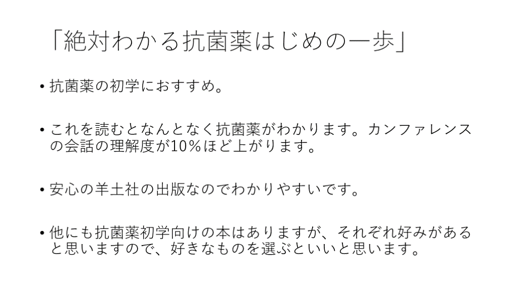 他にも抗菌薬初学向けの本はありますが、それぞれ好みがあると思いますので、好きなものを選ぶといいと思います。