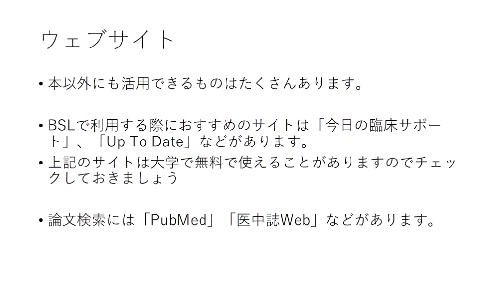 BSLで利用する際におすすめのサイトは「今日の臨床サポート」、「Up To Date」などがあります。