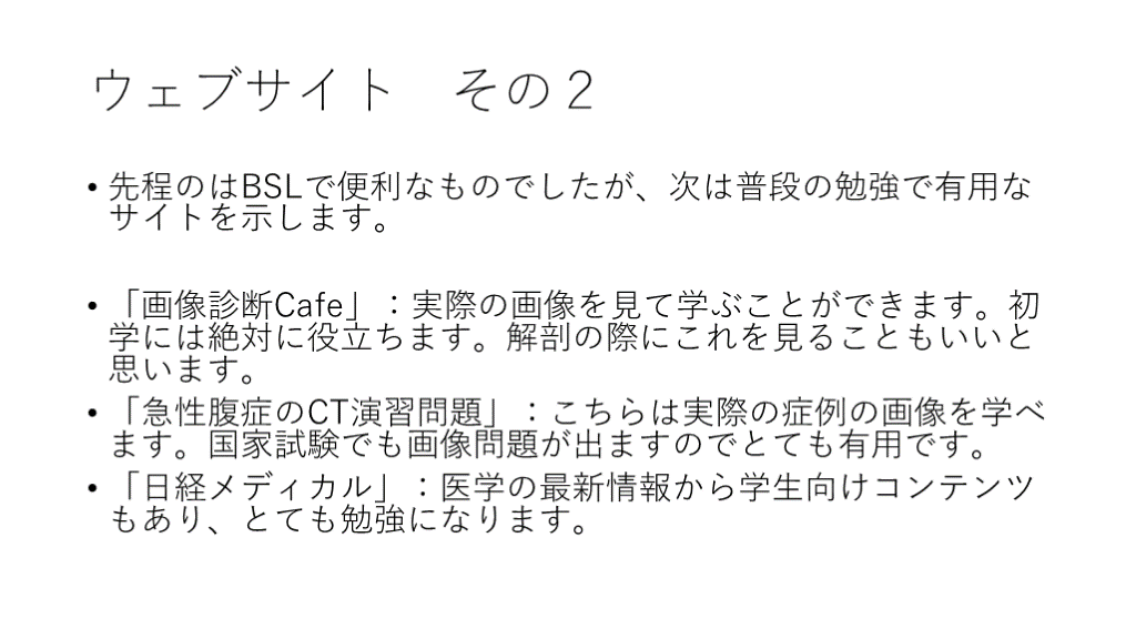 「画像診断Cafe」:実際の画像を見て学ぶことができます。初学には絶対に役立ちます。解剖の際にこれを見ることもいいと思います。