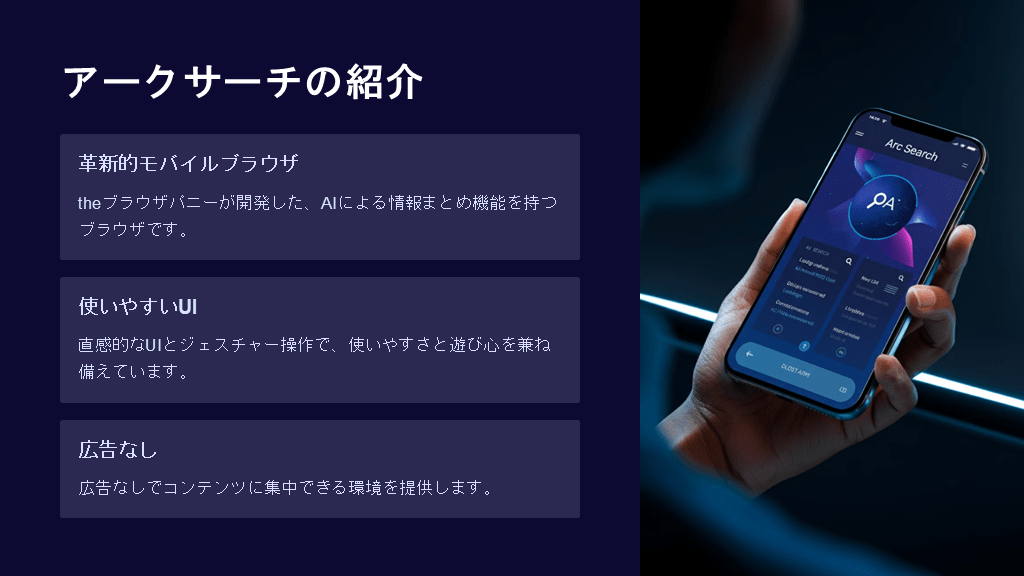 #2. アークサーチの紹介 革新的モバイルブラウザ theブラウザパニーが開発した、AIによる情報まとめ機能を持つブラウザです。 使いやすいUI 直感的なUIとジェスチャー操作で、使いやすさと遊び心を兼ね備えています。 広告なし 広告なしでコンテンツに集中できる環境を提供します。