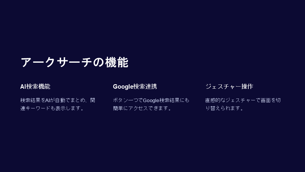 #3. アークサーチの機能 AI検索機能 検索結果をAIが自動でまとめ、関連キーワードも表示します。 Google検索連携 ボタン一つでGoogle検索結果にも簡単にアクセスできます。 ジェスチャー操作 直感的なジェスチャーで画面を切り替えられます。