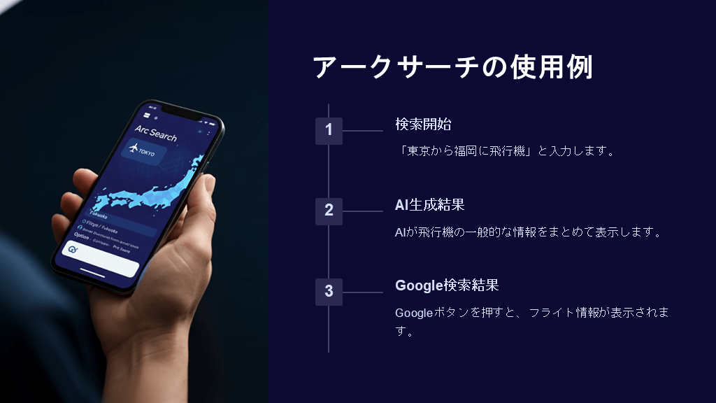 #4. アークサーチの使用例 1 検索開始 「東京から福岡に飛行機」と入力します。 2 AI生成結果 AIが飛行機の一般的な情報をまとめて表示します。 3 Google検索結果 Googleボタンを押すと、フライト情報が表示されます。