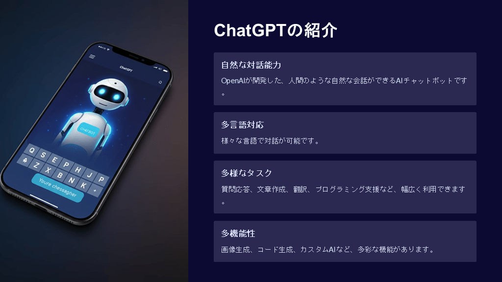 #5. ChatGPTの紹介 自然な対話能力 OpenAIが開発した、人間のような自然な会話ができるAIチャットボットです。 多言語対応 様々な言語で対話が可能です。 多様なタスク 質問応答、文章作成、翻訳、プログラミング支援など、幅広く利用できます。 多機能性 画像生成、コード生成、カスタムAIなど、多彩な機能があります。