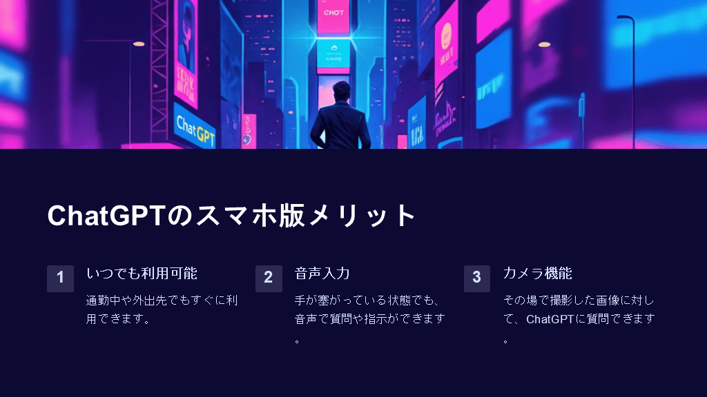 #6. ChatGPTのスマホ版メリット 1 いつでも利用可能 通勤中や外出先でもすぐに利用できます。 2 音声入力 手が塞がっている状態でも、音声で質問や指示ができます。 3 カメラ機能 その場で撮影した画像に対して、ChatGPTに質問できます。