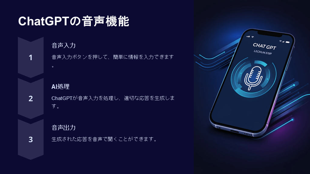 #7. ChatGPTの音声機能 音声入力 音声入力ボタンを押して、簡単に情報を入力できます。 AI処理 ChatGPTが音声入力を処理し、適切な応答を生成します。 音声出力 生成された応答を音声で聞くことができます。