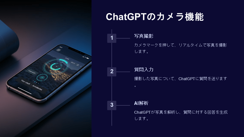 #8. ChatGPTのカメラ機能 1 写真撮影 カメラマークを押して、リアルタイムで写真を撮影します。 2 質問入力 撮影した写真について、ChatGPTに質問を送ります。 3 AI解析 ChatGPTが写真を解析し、質問に対する回答を生成します。