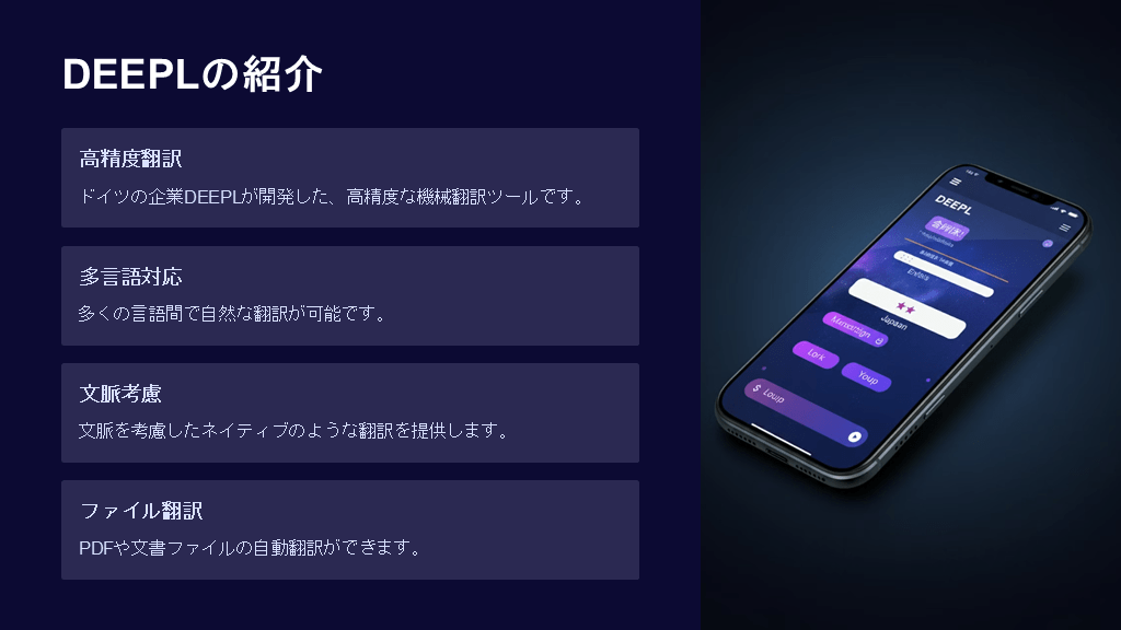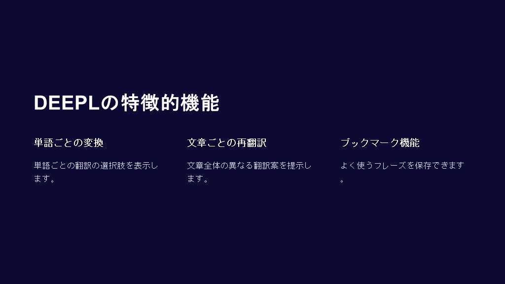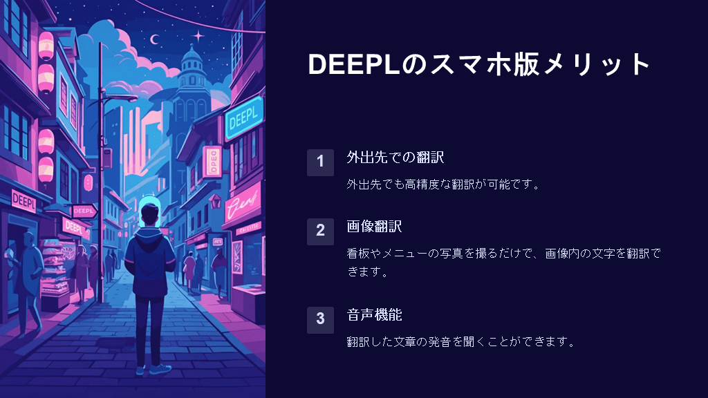 #10. DEEPLのスマホ版メリット 1 外出先での翻訳 外出先でも高精度な翻訳が可能です。 2 画像翻訳 看板やメニューの写真を撮るだけで、画像内の文字を翻訳できます。 3 音声機能 翻訳した文章の発音を聞くことができます。