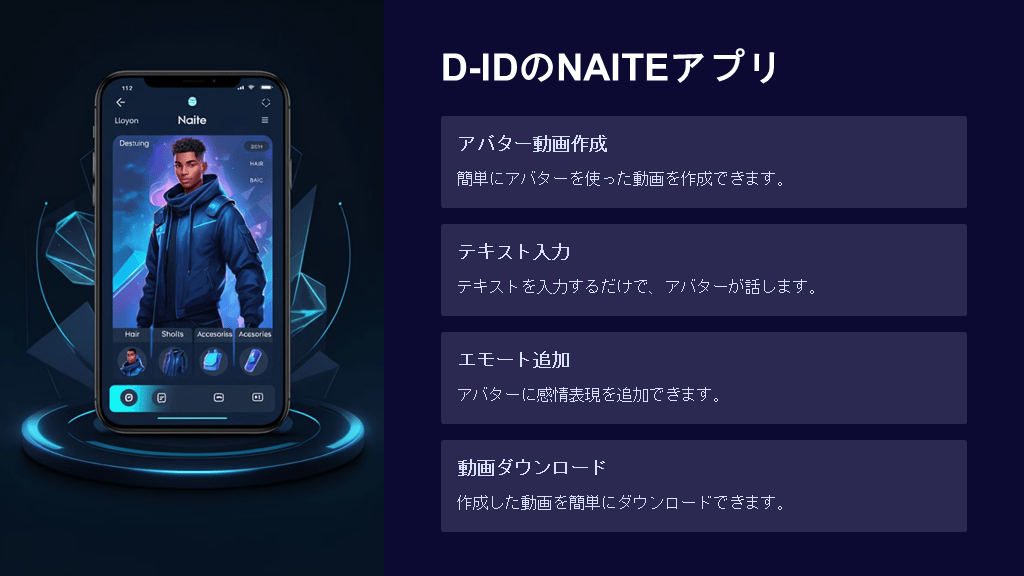 #12. D-IDのNAITEアプリ アバター動画作成 簡単にアバターを使った動画を作成できます。 テキスト入力 テキストを入力するだけで、アバターが話します。 エモート追加 アバターに感情表現を追加できます。 動画ダウンロード 作成した動画を簡単にダウンロードできます。