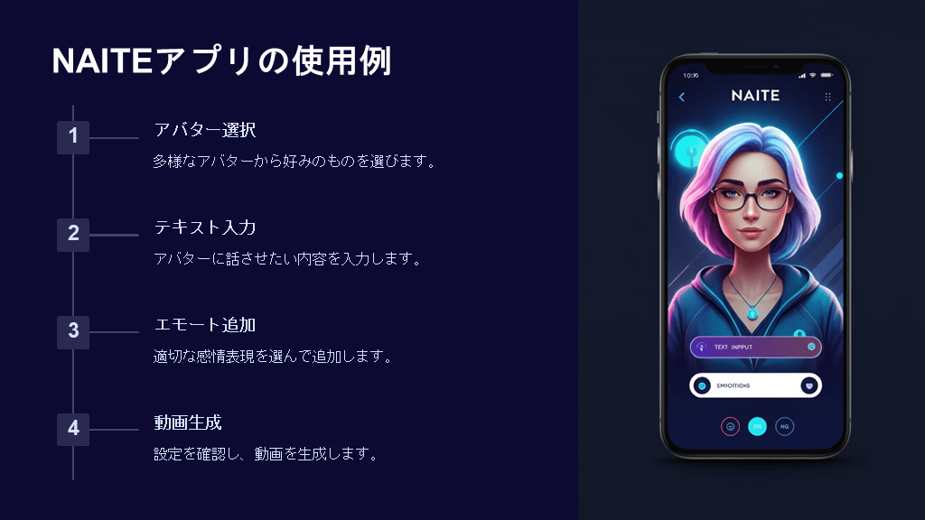 #13. NAITEアプリの使用例 1 アバター選択 多様なアバターから好みのものを選びます。 2 テキスト入力 アバターに話させたい内容を入力します。 3 エモート追加 適切な感情表現を選んで追加します。 4 動画生成 設定を確認し、動画を生成します。