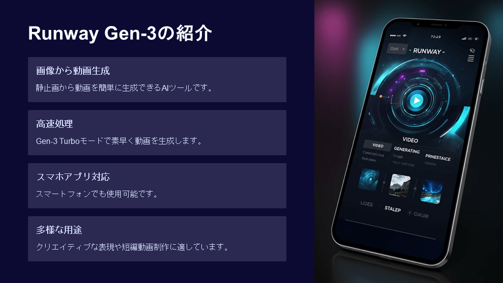#14. Runway Gen-3の紹介 画像から動画生成 静止画から動画を簡単に生成できるAIツールです。 高速処理 Gen-3 Turboモードで素早く動画を生成します。 スマホアプリ対応 スマートフォンでも使用可能です。 多様な用途 クリエイティブな表現や短編動画制作に適しています。