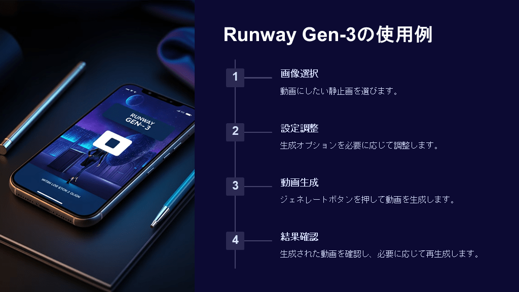 #15. Runway Gen-3の使用例 1 画像選択 動画にしたい静止画を選びます。 2 設定調整 生成オプションを必要に応じて調整します。 3 動画生成 ジェネレートボタンを押して動画を生成します。 4 結果確認 生成された動画を確認し、必要に応じて再生成します。