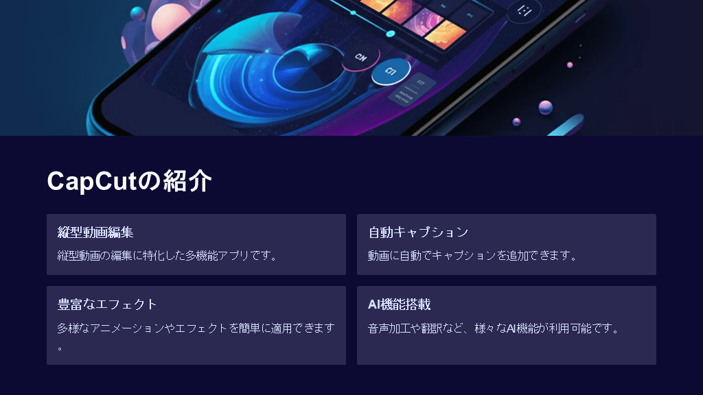 #16. CapCutの紹介 縦型動画編集 縦型動画の編集に特化した多機能アプリです。 自動キャプション 動画に自動でキャプションを追加できます。 豊富なエフェクト 多様なアニメーションやエフェクトを簡単に適用できます。 AI機能搭載 音声加工や翻訳など、様々なAI機能が利用可能です。