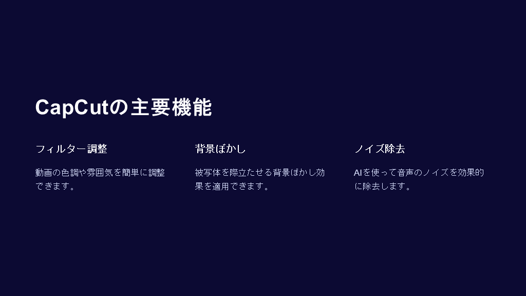 #17. CapCutの主要機能 フィルター調整 動画の色調や雰囲気を簡単に調整できます。 背景ぼかし 被写体を際立たせる背景ぼかし効果を適用できます。 ノイズ除去 AIを使って音声のノイズを効果的に除去します。