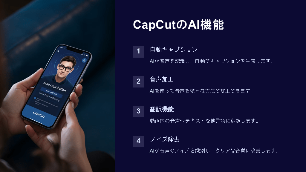 #18. CapCutのAI機能 1 自動キャプション AIが音声を認識し、自動でキャプションを生成します。 2 音声加工 AIを使って音声を様々な方法で加工できます。 3 翻訳機能 動画内の音声やテキストを他言語に翻訳します。 4 ノイズ除去 AIが音声のノイズを識別し、クリアな音質に改善します。