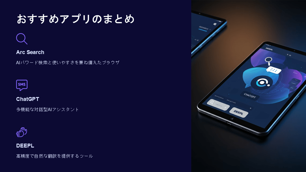 #19. おすすめアプリのまとめ Arc Search AIパワード検索と使いやすさを兼ね備えたブラウザ ChatGPT 多機能な対話型AIアシスタント DEEPL 高精度で自然な翻訳を提供するツール