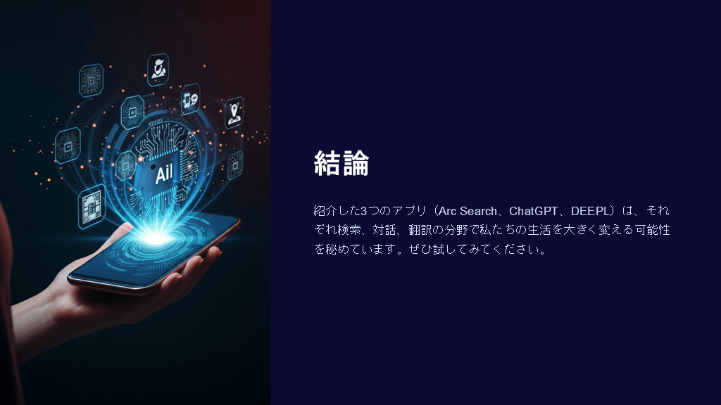#20. 結論 紹介した3つのアプリ(Arc Search、ChatGPT、DEEPL)は、それぞれ検索、対話、翻訳の分野で私たちの生活を大きく変える可能性を秘めています。ぜひ試してみてください。