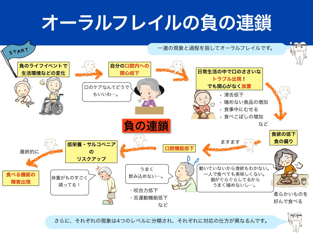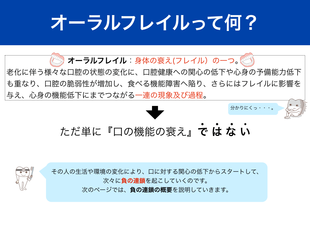 #9. オーラルフレイルって何? オーラルフレイル:身体の衰え(フレイル)の一つ。 老化に伴う様々な口腔の状態の変化に、口腔健康への関心の低下や心身の予備能力低下 も重なり、口腔の脆弱性が増加し、食べる機能障害へ陥り、さらにはフレイルに影響を 与え、心身の機能低下にまでつながる一連の現象及び過程。 分かりにくっ・・・。 ただ単に『口の機能の衰え』で は な い その人の生活や環境の変化により、口に対する関心の低下からスタートして、 次々に負の連鎖を起こしていくのです。 次のページでは、負の連鎖の概要を説明していきます。