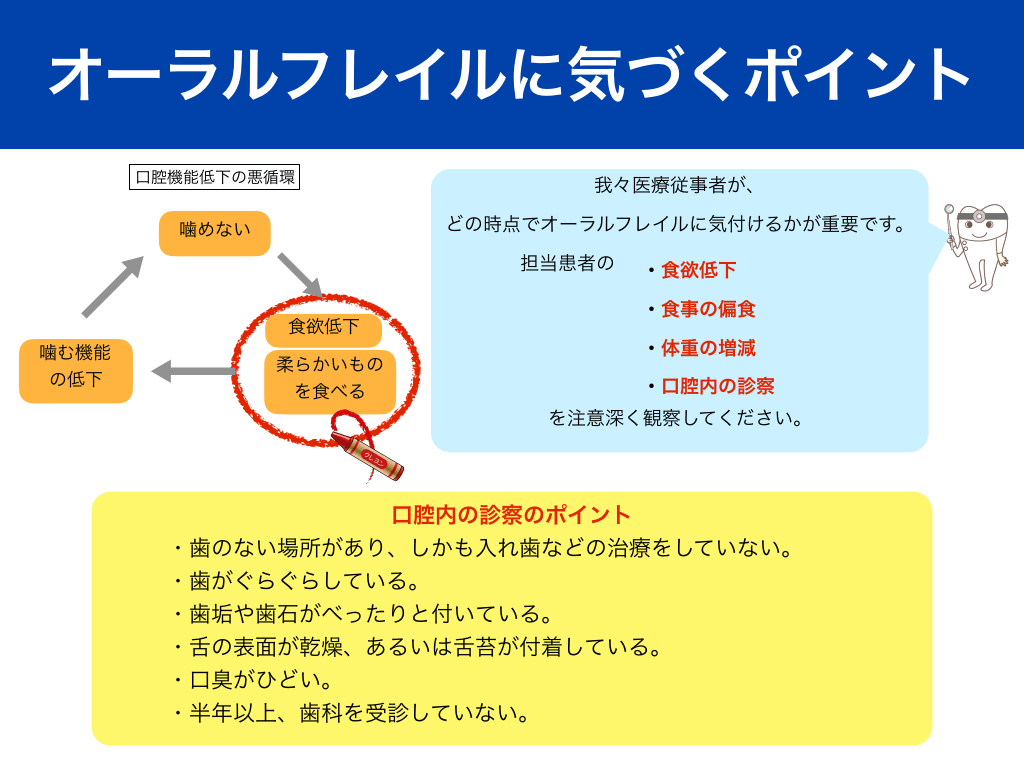 #11. オーラルフレイルに気づくポイント 口腔機能低下の悪循環 我々医療従事者が、 噛めない どの時点でオーラルフレイルに気付けるかが重要です。 担当患者の 食欲低下 噛む機能 の低下 柔らかいもの を食べる ・食欲低下 ・食事の偏食 ・体重の増減 ・口腔内の診察 を注意深く観察してください。 口腔内の診察のポイント ・歯のない場所があり、しかも入れ歯などの治療をしていない。 ・歯がぐらぐらしている。 ・歯垢や歯石がべったりと付いている。 ・舌の表面が乾燥、あるいは舌苔が付着している。 ・口臭がひどい。 ・半年以上、歯科を受診していない。