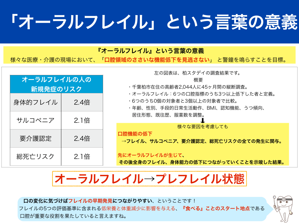 #12. 「オーラルフレイル」という言葉の意義 『オーラルフレイル』という言葉の意義 様々な医療・介護の現場において、「口腔領域のささいな機能低下を見逃さない」 と警鐘を鳴らすことを目標。 オーラルフレイルの人の 新規発症のリスク 身体的フレイル 2.4倍 サルコペニア 2.1倍 左の図表は、柏スタデイの調査結果です。 概要 ・千葉柏市在住の高齢者2,044人に45ヶ月間の縦断調査。 ・オーラルフレイル:6つの口腔指標のうち3つ以上低下した者と定義。 ・6つのうち0個の対象者と3個以上の対象者で比較。 ・年齢、性別、手段的日常生活動作、BMI、認知機能、うつ傾向、 居住形態、既往歴、服薬数を調整。 様々な要因を考慮しても 要介護認定 2.4倍 総死亡リスク 2.1倍 口腔機能の低下 →フレイル、サルコペニア、要介護認定、総死亡リスクの全ての発生に関与。 先にオーラルフレイルが生じて、 その後全身のフレイル、身体能力の低下につながっていくことを示唆した結果。 オーラルフレイル→プレフレイル状態 口の変化に気づけばフレイルの早期発見につながりやすい、ということです! フレイルの5つの評価基準に含まれる低栄養と体重減少に影響を与える、『食べる』ことのスタート地点である 口腔が重要な役割を果たしていると言えますね。