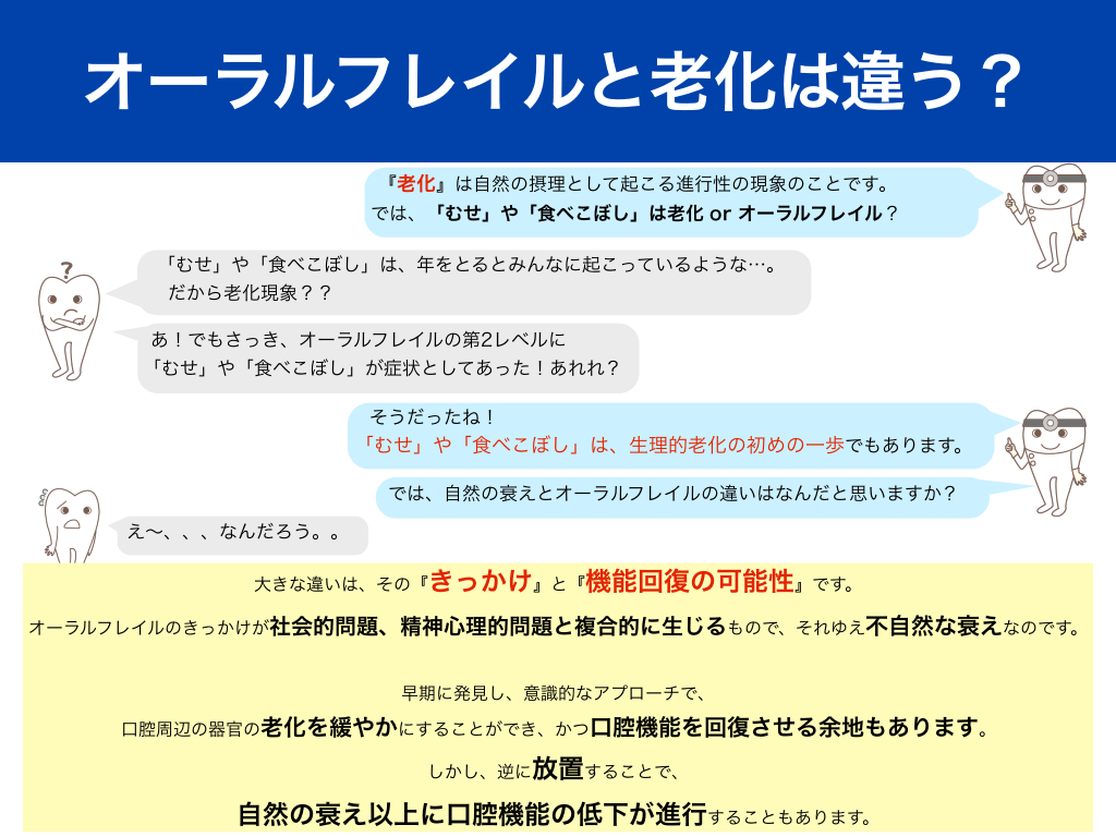 #13. オーラルフレイルと老化は違う? 『老化』は自然の摂理として起こる進行性の現象のことです。 では、「むせ」や「食べこぼし」は老化 or オーラルフレイル? 「むせ」や「食べこぼし」は、年をとるとみんなに起こっているような…。 だから老化現象?? あ!でもさっき、オーラルフレイルの第2レベルに 「むせ」や「食べこぼし」が症状としてあった!あれれ? そうだったね! 「むせ」や「食べこぼし」は、生理的老化の初めの一歩でもあります。 では、自然の衰えとオーラルフレイルの違いはなんだと思いますか? え〜、、、なんだろう。。 大きな違いは、その『きっかけ』と『機能回復の可能性』です。 オーラルフレイルのきっかけが社会的問題、精神心理的問題と複合的に生じるもので、それゆえ不自然な衰えなのです。 早期に発見し、意識的なアプローチで、 口腔周辺の器官の老化を緩やかにすることができ、かつ口腔機能を回復させる余地もあります。 しかし、逆に放置することで、 自然の衰え以上に口腔機能の低下が進行することもあります。