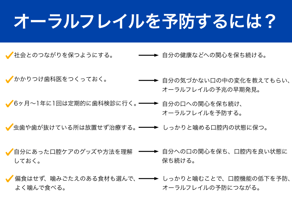 #14. オーラルフレイルを予防するには? 社会とのつながりを保つようにする。 自分の健康などへの関心を保ち続ける。 かかりつけ歯科医をつくっておく。 自分の気づかない口の中の変化を教えてもらい、 オーラルフレイルの予兆の早期発見。 6ヶ月〜1年に1回は定期的に歯科検診に行く。 自分の口への関心を保ち続け、 オーラルフレイルを予防する。 虫歯や歯が抜けている所は放置せず治療する。 しっかりと噛める口腔内の状態に保つ。 自分にあった口腔ケアのグッズや方法を理解 自分への口の関心を保ち、口腔内を良い状態に しておく。 保ち続ける。 偏食はせず、噛みごたえのある食材も選んで、 しっかりと噛むことで、口腔機能の低下を予防、 よく噛んで食べる。 オーラルフレイルの予防につながる。