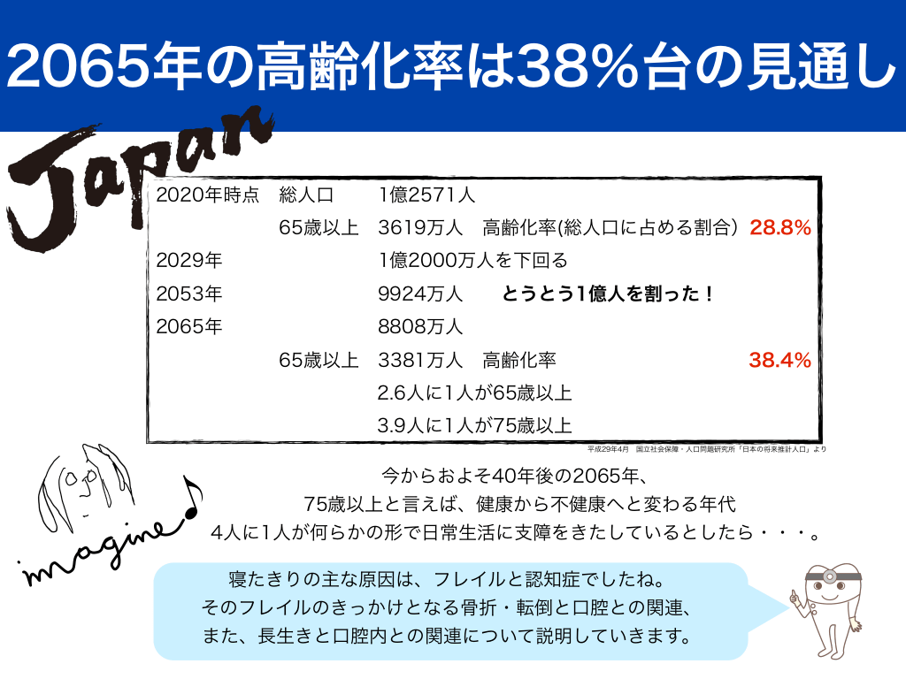 #15. 2065年の高齢化率は38%台の見通し 2020年時点 総人口 1億2571人 65歳以上 3619万人 高齢化率(総人口に占める割合)28.8% 2029年 1億2000万人を下回る 2053年 9924万人 2065年 8808万人 65歳以上 3381万人 とうとう1億人を割った! 高齢化率 38.4% 2.6人に1人が65歳以上 3.9人に1人が75歳以上 平成29年4月 国立社会保障・人口問題研究所「日本の将来推計人口」より 今からおよそ40年後の2065年、 75歳以上と言えば、健康から不健康へと変わる年代 4人に1人が何らかの形で日常生活に支障をきたしているとしたら・・・。 寝たきりの主な原因は、フレイルと認知症でしたね。 そのフレイルのきっかけとなる骨折・転倒と口腔との関連、 また、長生きと口腔内との関連について説明していきます。
