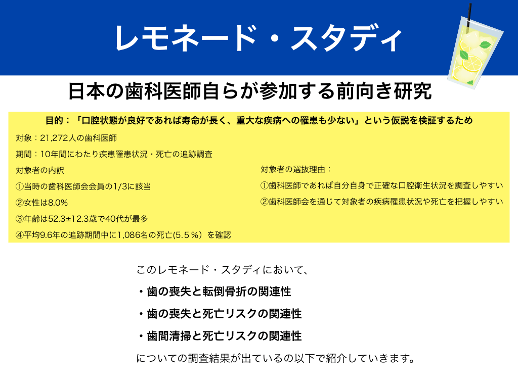 #16. レモネード・スタディ 日本の歯科医師自らが参加する前向き研究 目的:「口腔状態が良好であれば寿命が長く、重大な疾病への罹患も少ない」という仮説を検証するため 対象:21,272人の歯科医師 期間:10年間にわたり疾患罹患状況・死亡の追跡調査 対象者の内訳 対象者の選抜理由: ①当時の歯科医師会会員の1/3に該当 ①歯科医師であれば自分自身で正確な口腔衛生状況を調査しやすい ②女性は8.0% ②歯科医師会を通じて対象者の疾病罹患状況や死亡を把握しやすい ③年齢は52.3 12.3歳で40代が最多 ④平均9.6年の追跡期間中に1,086名の死亡(5.5%)を確認 このレモネード・スタディにおいて、 ・歯の喪失と転倒骨折の関連性 ・歯の喪失と死亡リスクの関連性 ・歯間清掃と死亡リスクの関連性 についての調査結果が出ているの以下で紹介していきます。