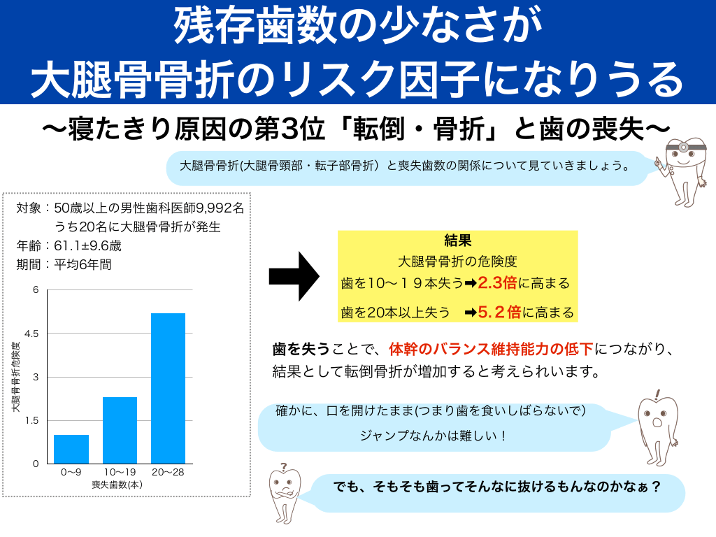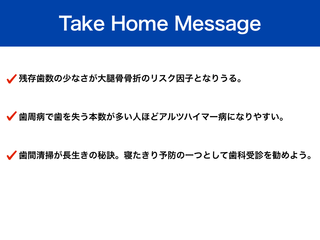 #2. Take Home Message 残存歯数の少なさが大腿骨骨折のリスク因子となりうる。 歯周病で歯を失う本数が多い人ほどアルツハイマー病になりやすい。 歯間清掃が長生きの秘訣。寝たきり予防の一つとして歯科受診を勧めよう。