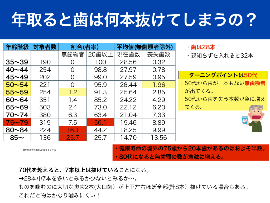 #18. ➡︎ 年取ると歯は何本抜けてしまうの? 年齢階級 対象者数 35〜39 40〜44 45〜49 50〜54 55〜59 60〜64 65〜69 70〜74 75〜79 80〜84 85〜 190 254 202 221 254 351 503 380 319 224 136 割合(者率) 平均値(無歯顎者除外) 無歯顎者 20歯以上 現在歯数 喪失歯数 0 100 28.56 0.32 0 98.8 27.97 0.78 0 99.0 27.59 0.95 0 95.9 26.44 1.96 1.2 91.3 25.64 2.85 1.4 85.2 24.22 4.29 2.4 73.0 22.12 6.20 6.3 63.4 21.04 7.33 7.5 56.1 19.46 8.89 16.1 44.2 18.25 9.99 25.7 25.7 14.70 13.56 歯科疾患実態調査2016年より作成 ・歯は28本 ・親知らずを入れると32本 ターニングポイントは50代 ・50代から歯が一本もない無歯顎者 が出てくる。 ・50代から歯を失う本数が急に増え てくる。 ・健康寿命の境界の75歳から20本歯があるのはおよそ半数。 ・80代になると無歯顎の数が急激に増える。 70代を超えると、7本以上は抜けていることになる。 28本中7本を多いとみるか少ないとみるか…。 ものを噛むのに大切な奥歯2本(大臼歯)が上下左右ほぼ全部(計8本)抜けている場合もある。 これだと物はかなり噛みにくい!