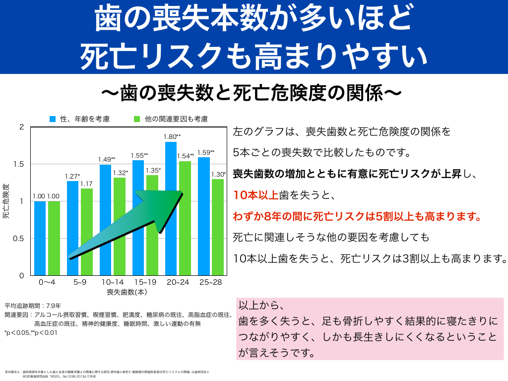 #19. 歯の喪失本数が多いほど 死亡リスクも高まりやすい 〜歯の喪失数と死亡危険度の関係〜 性、年齢を考慮 他の関連要因も考慮 2 左のグラフは、喪失歯数と死亡危険度の関係を 1.80** 1.49** 死亡危険度 1.5 1.27* 1.17 1 1.32* 1.55** 1.54** 1.59** 1.35* 1.30* 5本ごとの喪失数で比較したものです。 喪失歯数の増加とともに有意に死亡リスクが上昇し、 10本以上歯を失うと、 1.00 1.00 わずか8年の間に死亡リスクは5割以上も高まります。 死亡に関連しそうな他の要因を考慮しても 0.5 10本以上歯を失うと、死亡リスクは3割以上も高まります。 0 0〜4 5~9 10~14 15~19 喪失歯数(本) 20~24 25~28 平均追跡期間:7.9年 関連要因:アルコール摂取習慣、喫煙習慣、肥満度、糖尿病の既往、高脂血症の既往、 高血圧症の既往、精神的健康度、睡眠時間、激しい運動の有無 *p<0.05,**p<0.01 以上から、 歯を多く失うと、足も骨折しやすく結果的に寝たきりに つながりやすく、しかも長生きしにくくなるということ が言えそうです。 若井建志ら:歯科医師を対象とした歯と全身の健康,栄養との関連に関する研究-喪失歯と総死亡,動脈硬化関連疾患,肺炎死亡リスクとの関連-.公益財団法人 8020推進財団会誌「8020」,No12:96,2013より作成